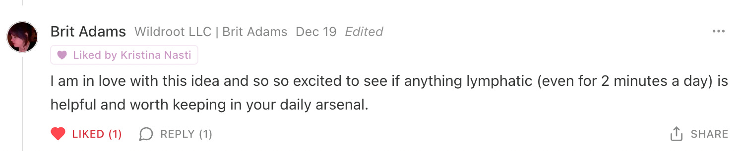 What this has taught me is that discipline, keeping promises to myself, and choosing a practice that seamlessly fits into my life create something that eventually feels like second nature. I prioritize my lymph practice in the same way that I do brushing my teeth. I don’t intend to give it up.